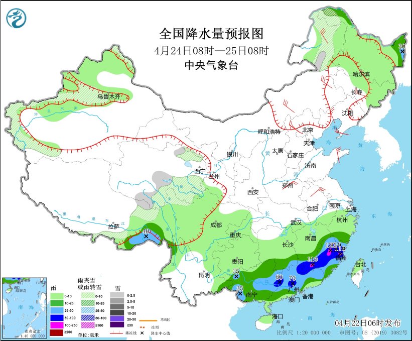 4月24日08时至25日08时,新疆沿天山地区和南疆西部山区、青海中东部、内蒙古东北部、西藏东北部、川西高原北部等地部分地区有小雪或雨夹雪。江南南部、华南大部以及黑龙江东北部、西藏东南部等地部分地区有中到大雨,其中,江西南部、福建西部和北部、广西东部、广东中北部等地部分地区有暴雨到大暴雨(100~120毫米)。内蒙古东部、东北地区大部、河北北部、黄淮大部、苏皖北部等地部分地区有4~6级风。