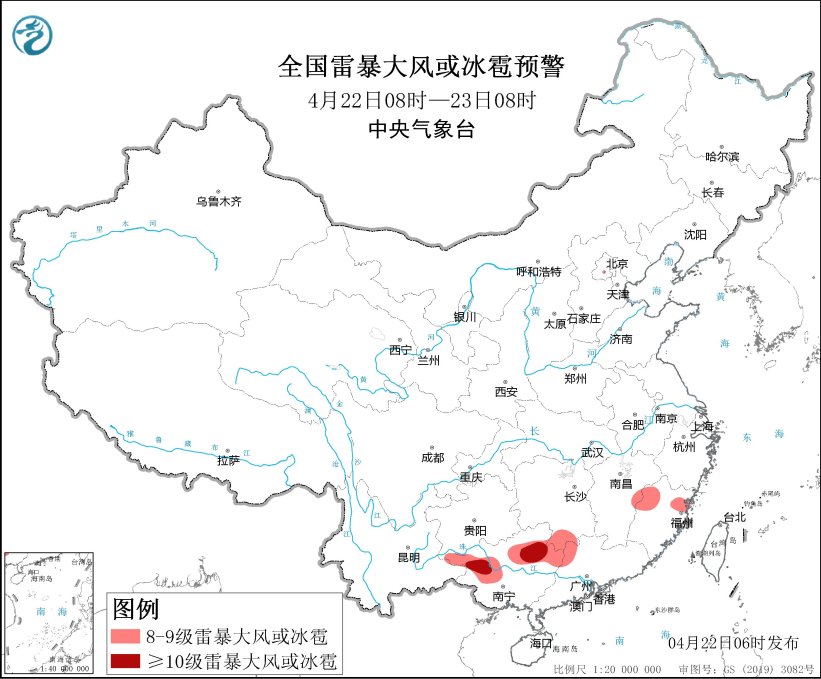 全国雷暴大风或冰雹预警图(4月22日08时-23日08时) 图片来源:中央气象台网站