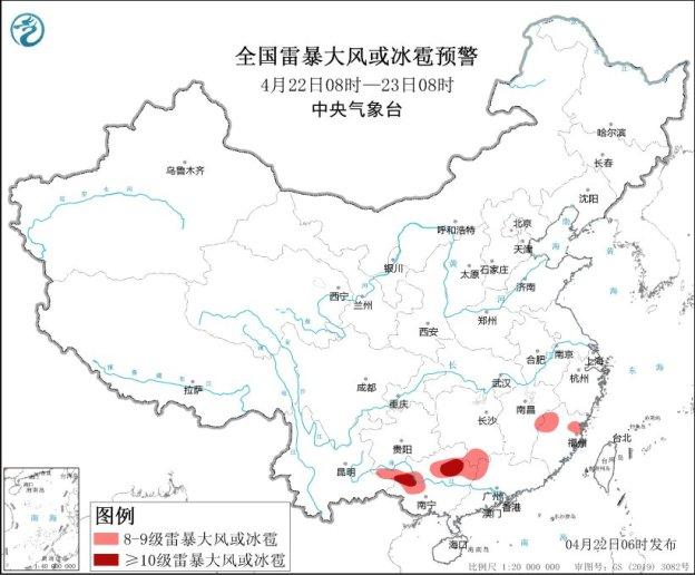目前,湖南南部、江西有较强回波在活动,中央气象台今晨继续发布暴雨及强对流天气蓝色预警。预计,今天白天至夜间,降水强度较昨天有所减弱,主雨带将南压至广西北部至浙江南部一带,浙江南部、福建西部和北部、江西中南部、广西西部和北部、广东北部等地有大雨或暴雨;江南东部、华南西部等地部分地区将有8级以上雷暴大风或冰雹天气,其中,广西西部和东北部等局地将有10级以上雷暴大风。23日夜间,降雨强度将再度加强。