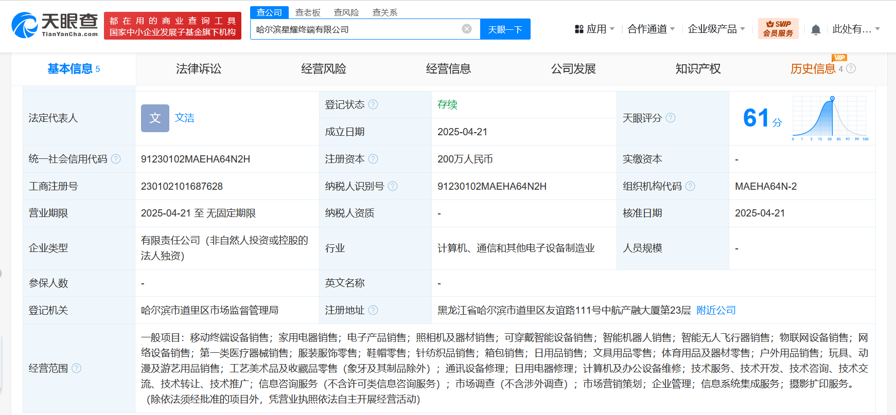 天眼查App显示,近日,哈尔滨星耀终端有限公司成立,法定代表人为文洁,注册资本200万人民币,经营范围含移动终端设备销售、家用电器销售、电子产品销售、可穿戴智能设备销售、智能机器人销售、智能无人飞行器销售、物联网设备销售等。股权全景穿透图显示,该公司由深圳星耀终端有限公司全资持股,后者为荣耀终端股份有限公司全资子公司。