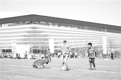 在雄安体育中心,机器人为儿童足球赛开球。本报记者 陈汝健摄