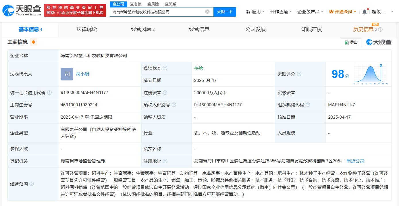 天眼查App显示,近日,海南新希望六和农牧科技有限公司成立,法定代表人为司小明,注册资本20亿人民币,经营范围包括饲料生产、牲畜饲养、农作物种子经营等。股权全景穿透图显示,该公司由新希望(000876)旗下北京新希望六和生物科技产业集团有限公司全资持股。