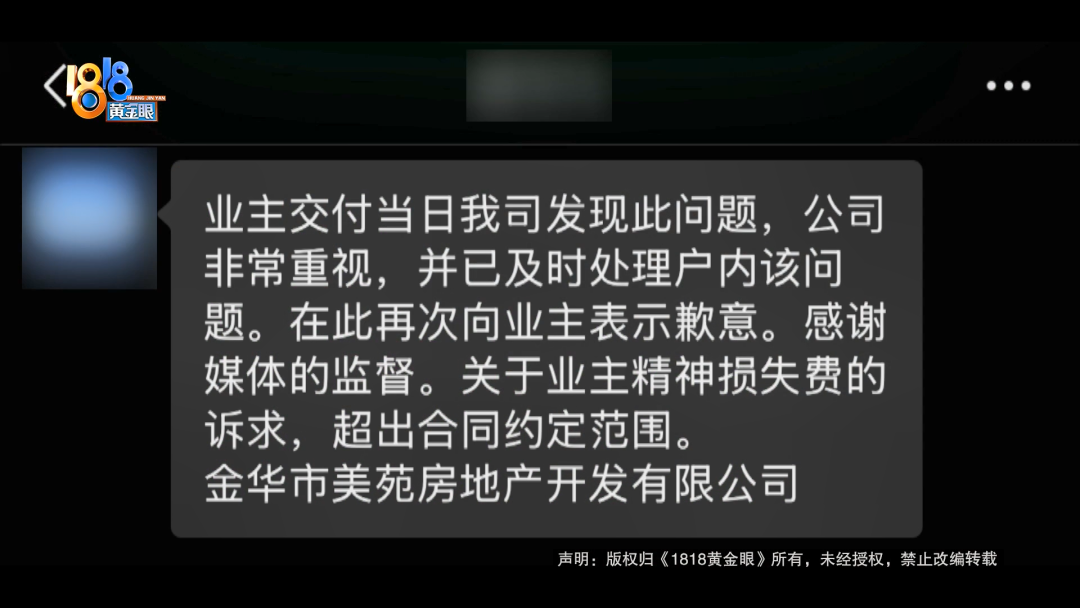 物业经理告诉记者,房子现在还没移交给物业,具体情况还是得联系开发商,他留下了记者的联系方式。后来开发商金华市美苑房地产开发有限公司回复记者,业主交付当日发现此问题,公司非常重视,并及时处理户内问题,再次向业主表示歉意。关于业主精神损失费的诉求,超出了合同约定范围。