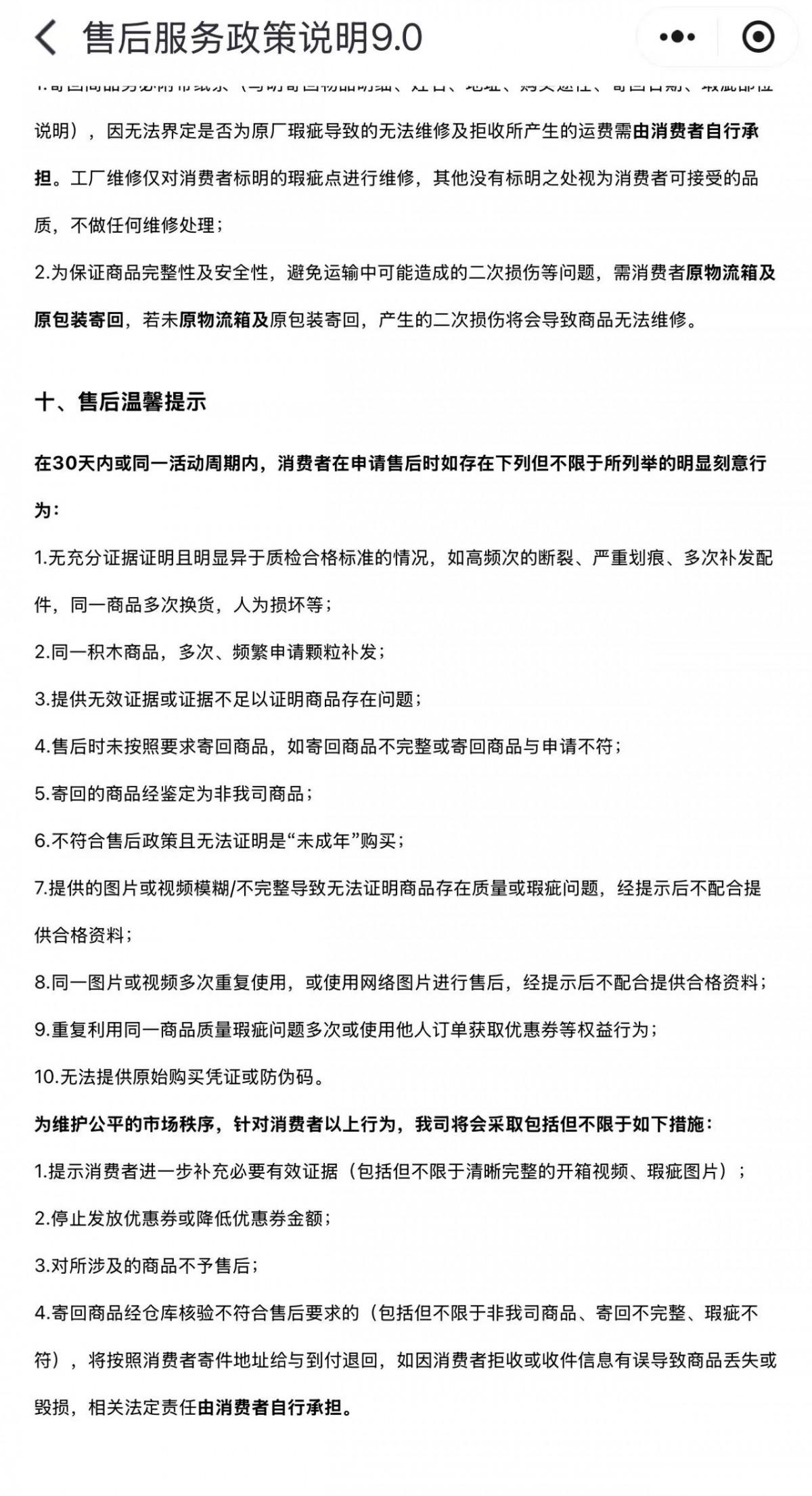 但与此同时,泡泡玛特还规定,如果消费者在申请售后时存在同一商品多次换货等行为,泡泡玛特也会采取不予售后等措施。只不过,换了多少次货会被认定为“多次换货”,售后政策里没有明确说明。