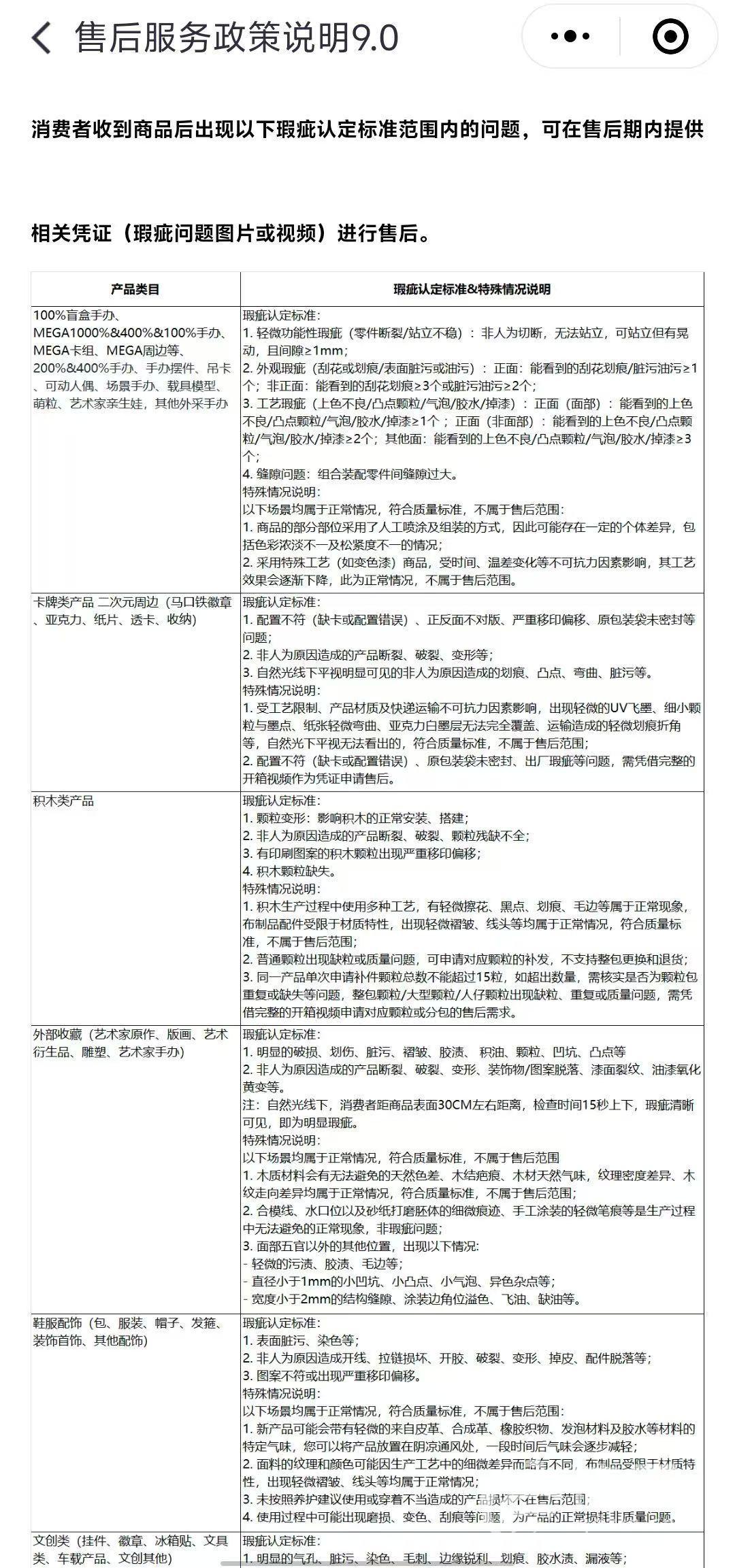 在“泡泡玛特抽盒机”上,有商家制定的关于盲盒售后规则,其中对于瑕疵的认定有明确说明,例如正面能看到至少一个刮花或者脏污油污,正面面部至少有一处上色不良、凸点颗粒、气泡、胶水、掉漆的,消费者都可以凭瑕疵图片或者视频进行售后。