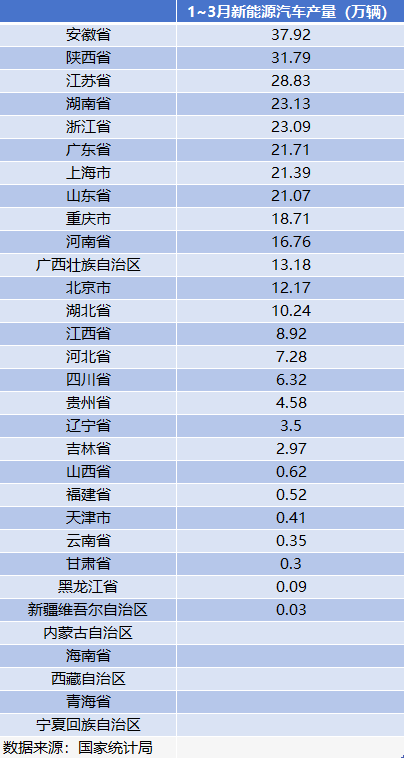 从新能源汽车产量的排名来看,前五位都不是传统汽车强省。1~3月,安徽、陕西、江苏、湖南、浙江分别生产新能源汽车37.92万、31.79万、28.83万、23.13万和23.09万辆;此外,山东和河南分别生产21.07万和16.76万辆,也挤进了十强。