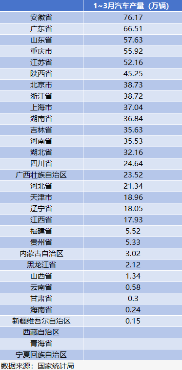 根据国家统计局数据库,今年一季度各省份汽车产量排名中,安徽以76.17万辆位居全国第一,超过第二位的广东(66.51万辆)近10万辆,领先优势相比1~2月的数据扩大。