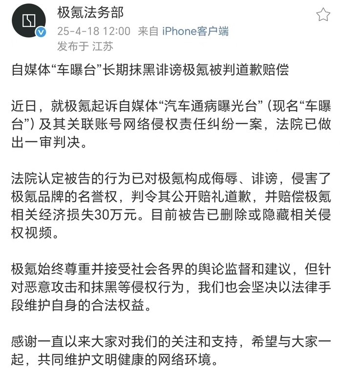 4月18日,极氪法务部微博账号发文称,近日,就极氪起诉自媒体“汽车通病曝光台”(现名“车曝台”)及其关联账号网络侵权责任纠纷一案,法院已做出一审判决。