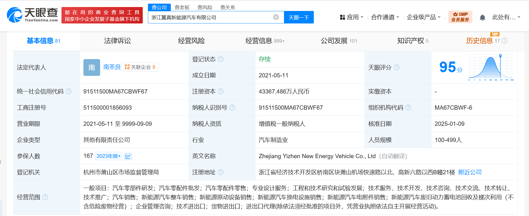 天眼查App显示,近日,浙江翼真新能源汽车有限公司发生工商变更,李东辉卸任董事长,由淦家阅接任。