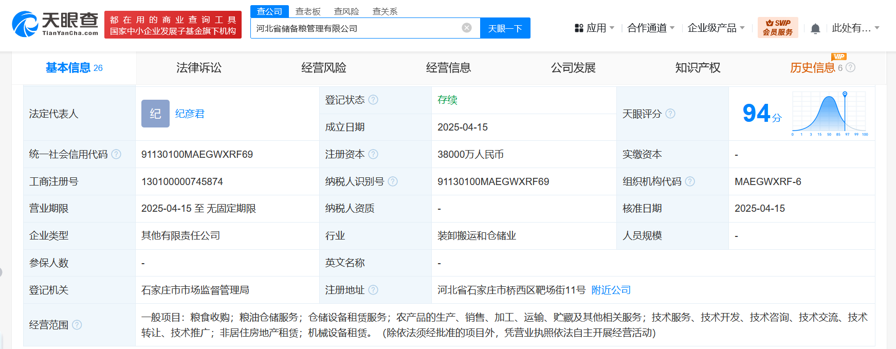 天眼查App显示,近日,河北省储备粮管理有限公司成立,法定代表人为纪彦君,注册资本3.8亿人民币,经营范围含粮食收购,粮油仓储服务,仓储设备租赁服务,农产品的生产、销售、加工、运输、贮藏及其他相关服务等。股东信息显示,该公司由河北省粮食产业集团有限公司、河北省油脂储备库有限公司共同持股。