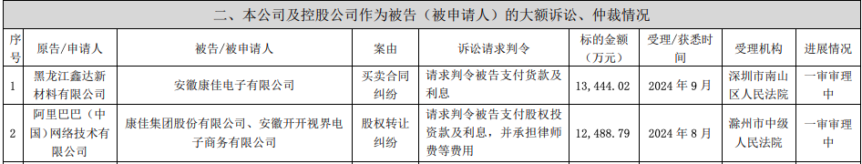 昔日合作伙伴“翻脸”的不止江西康佳。红星资本局注意到,在康佳集团4月15日披露的公告中,阿里巴巴(中国)网络技术有限公司于2024年将康佳集团和开开视界诉至法庭,案由为股权转让纠纷,要求后者支付股权投资款及利息,涉案金额约为1.2亿元。