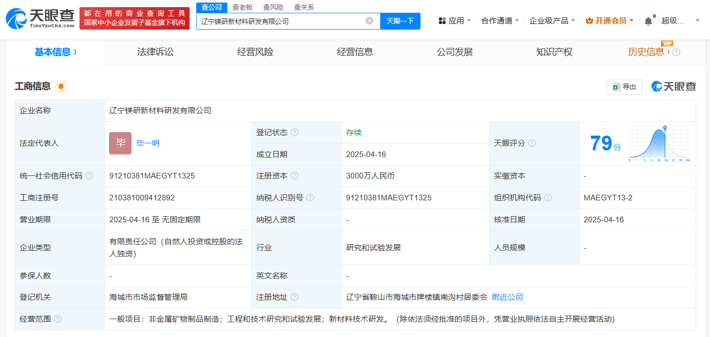 天眼查App显示,近日,辽宁镁研新材料研发有限公司成立,法定代表人为毕一明,注册资本3000万人民币,经营范围包括非金属矿物制品制造、工程和技术研究和试验发展、新材料技术研发。股东信息显示,该公司由东和新材(839792)全资持股。