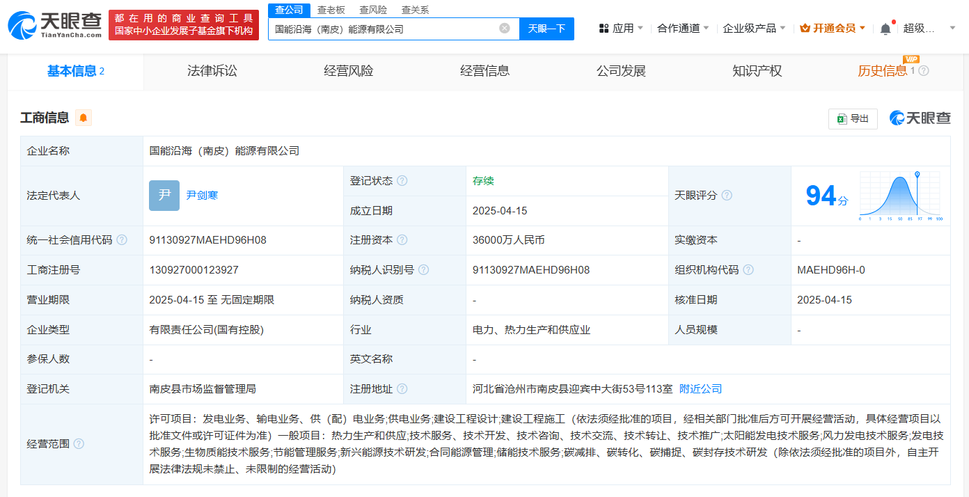 天眼查App显示,近日,国能沿海(南皮)能源有限公司成立,法定代表人为尹剑寒,注册资本3.6亿人民币,经营范围包括太阳能发电技术服务、风力发电技术服务、发电技术服务、生物质能技术服务等。股权全景穿透图显示,该公司由国能(河北)沿海能源发展有限责任公司全资持股,后者由国家能源集团河北电力有限公司、河北高速公路集团有限公司共同持股。