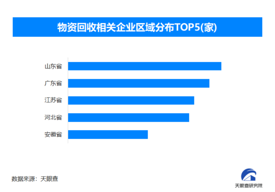 从区域分布来看,山东省、广东省、江苏省物资回收相关企业数量位居前列,分别为超过2.4万余家、2.2万余家和1.9万余家。