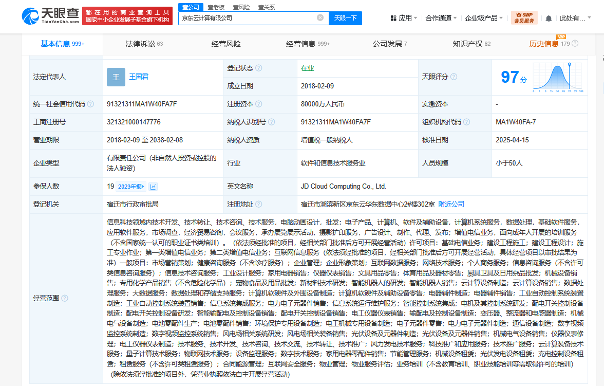 天眼查App显示,近日,京东云计算有限公司发生工商变更,注册资本由5亿人民币增至8亿人民币,增幅60%。