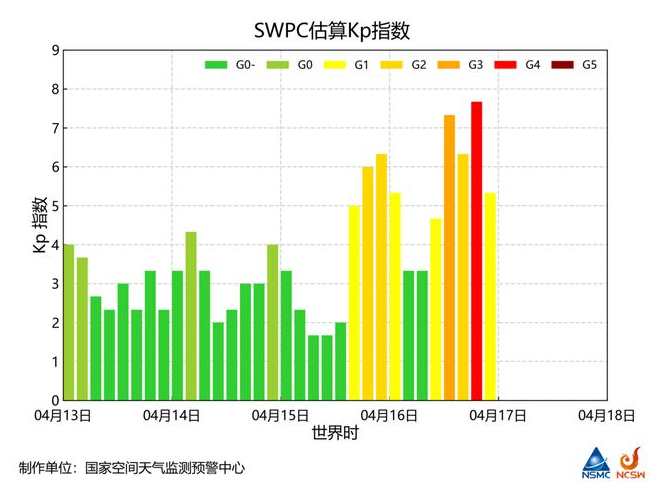 今年4月16日的这次地磁暴能量也不小。从国家空间天气监测预警中心17日09:30发布的空间天气预报可以了解到,过去24小时,出现了3小时特大地磁暴,3小时大地磁暴,3小时中等地磁暴,6小时小地磁暴,KP指数最大值为7.67,其余时间地磁活动微扰到活跃。我国南方部分地区出现弱电离层闪烁。