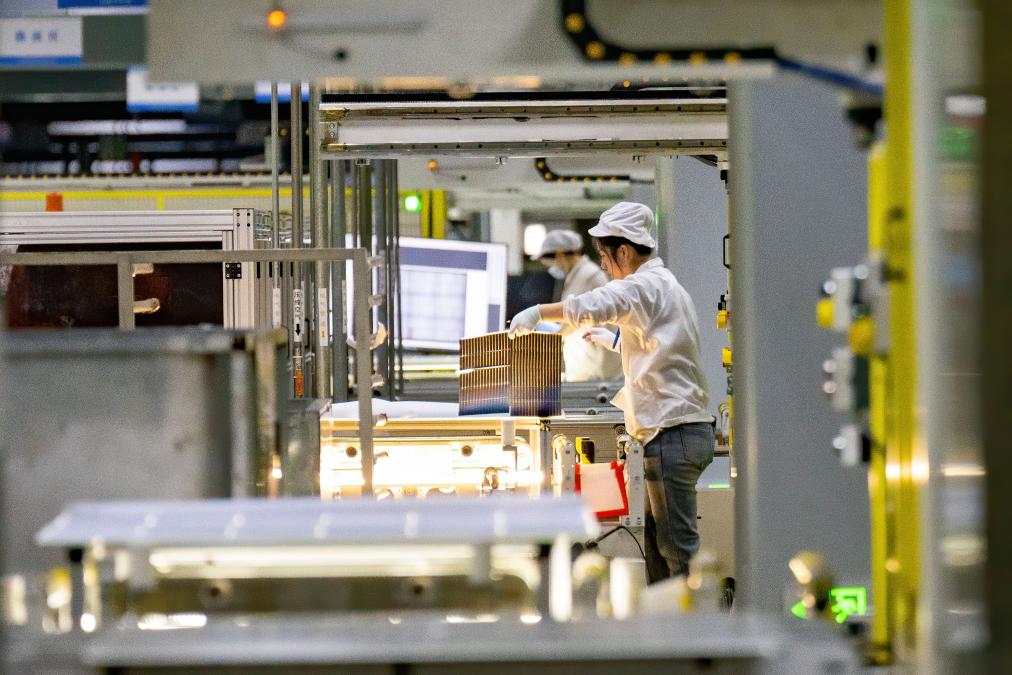 2月13日,在位于安徽省合肥市肥东县的合肥循环经济示范园内一光伏组件企业车间,工人在生产线上忙碌。新华社发(阮雪枫摄)
