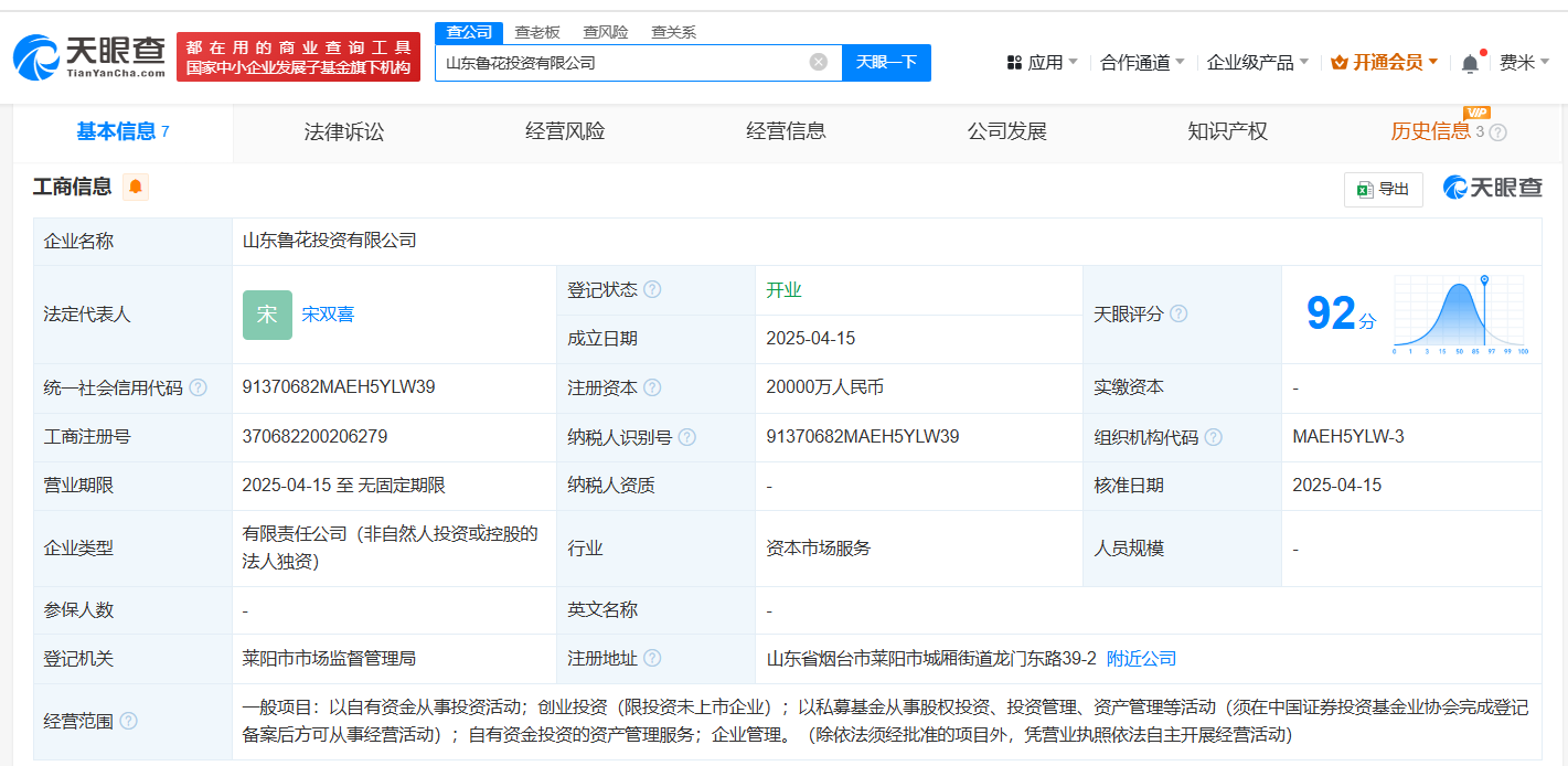 天眼查App显示,近日,山东鲁花投资有限公司成立,法定代表人为宋双喜,注册资本2亿人民币,经营范围包括以自有资金从事投资活动、创业投资、企业管理等,由山东鲁花控股集团有限公司全资持股。最终受益人信息显示,该公司实际控制人为孙孟全。公开资料显示,孙孟全为山东鲁花集团创始人。