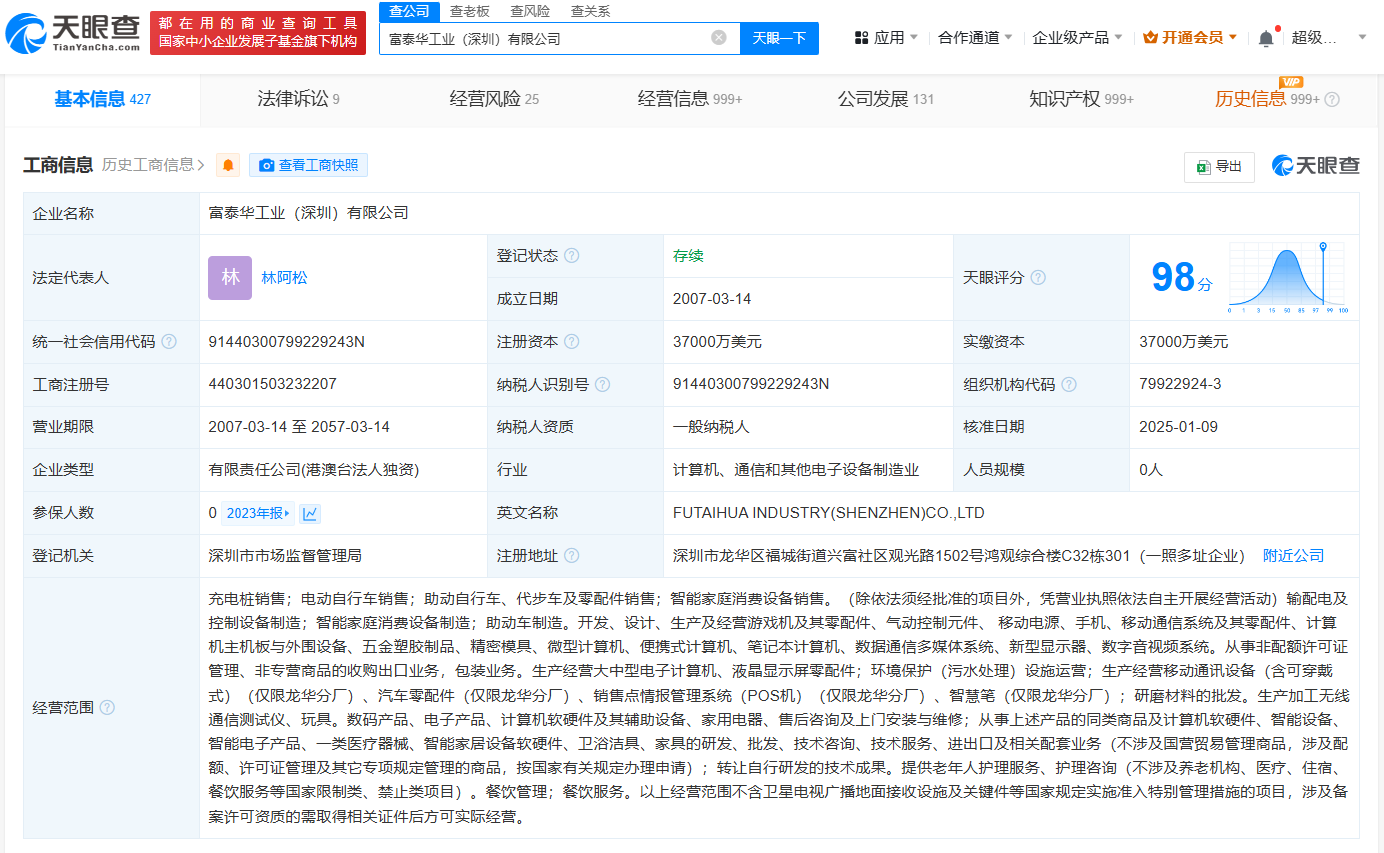 该公司成立于2007年3月,法定代表人为林阿松,注册资本3.7亿美元,经营范围包括充电桩销售、电动自行车销售、智能家庭消费设备销售等,由中坚企业有限公司全资持股。公开信息显示,富泰华工业(深圳)有限公司是富士康科技集团旗下全球3C(计算机、通讯、消费性电子)代工领域规模最大、成长最快、评价最高的国际公司。