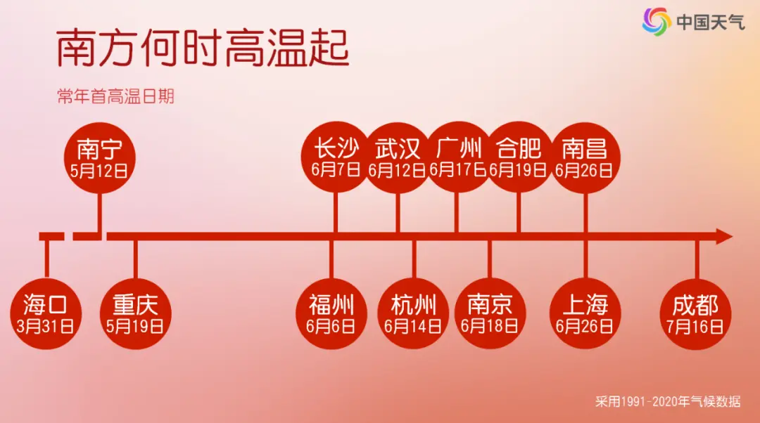 常年来看,北方高温一般比南方来得早,其中,石家庄、郑州、西安等地的平均首个高温日甚至比大多数南方城市还要早一些,仅次于海口、南宁、重庆。长江中下游等地的武汉、南京、长沙、杭州、上海等地通常在6月份才会迎来首个高温日。