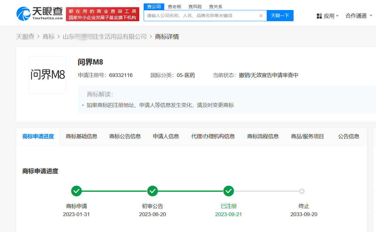 天眼查知识产权信息显示,“问界M8”已被申请注册为商标,申请人为山东某生活用品公司,国际分类为医药,上述商标已于2023年9月注册成功。不过,商标流程信息显示,该商标已于近期被无效宣告,当前商标状态为撤销/无效宣告申请审查中。