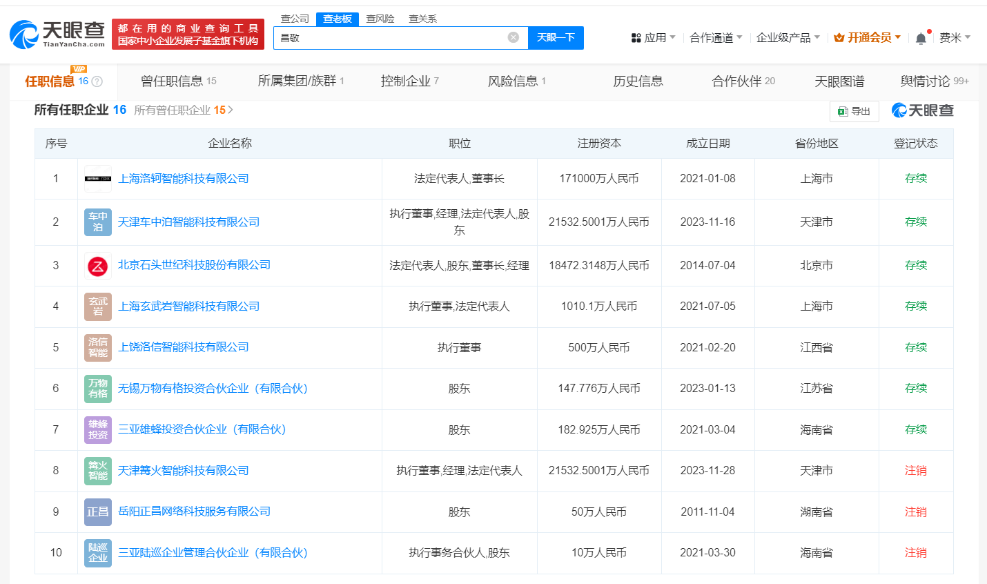 天眼查App显示,昌敬名下关联16家企业,其中7家为存续状态,包括极石汽车关联企业上海洛轲智能科技有限公司、石头科技关联企业北京石头世纪科技股份有限公司、天津车中泊智能科技有限公司等,版图涉及智能科技、投资等,昌敬在上述公司担任法定代表人、董事长或者经理等职位。此外有9家企业已注销,包括天津篝火智能科技有限公司、岳阳正昌网络科技服务有限公司等。