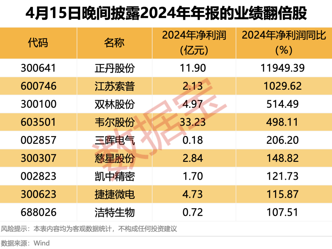 值得注意的是,昨日晚间披露2024年年报的70余家上市公司中,9家2024年净利润规模同比呈现翻倍,增幅均超100%。