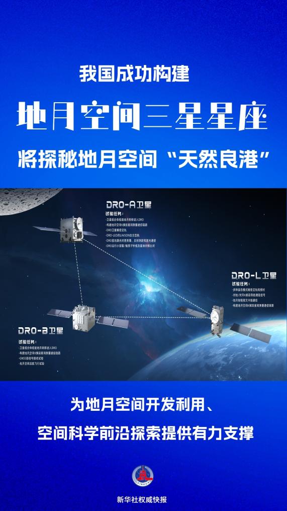 记者从中国科学院空间应用工程与技术中心获悉,我国已成功构建由三颗卫星组成的地月空间三星星座,将聚焦地月空间远距离逆行轨道(DRO)开展深入科学研究。