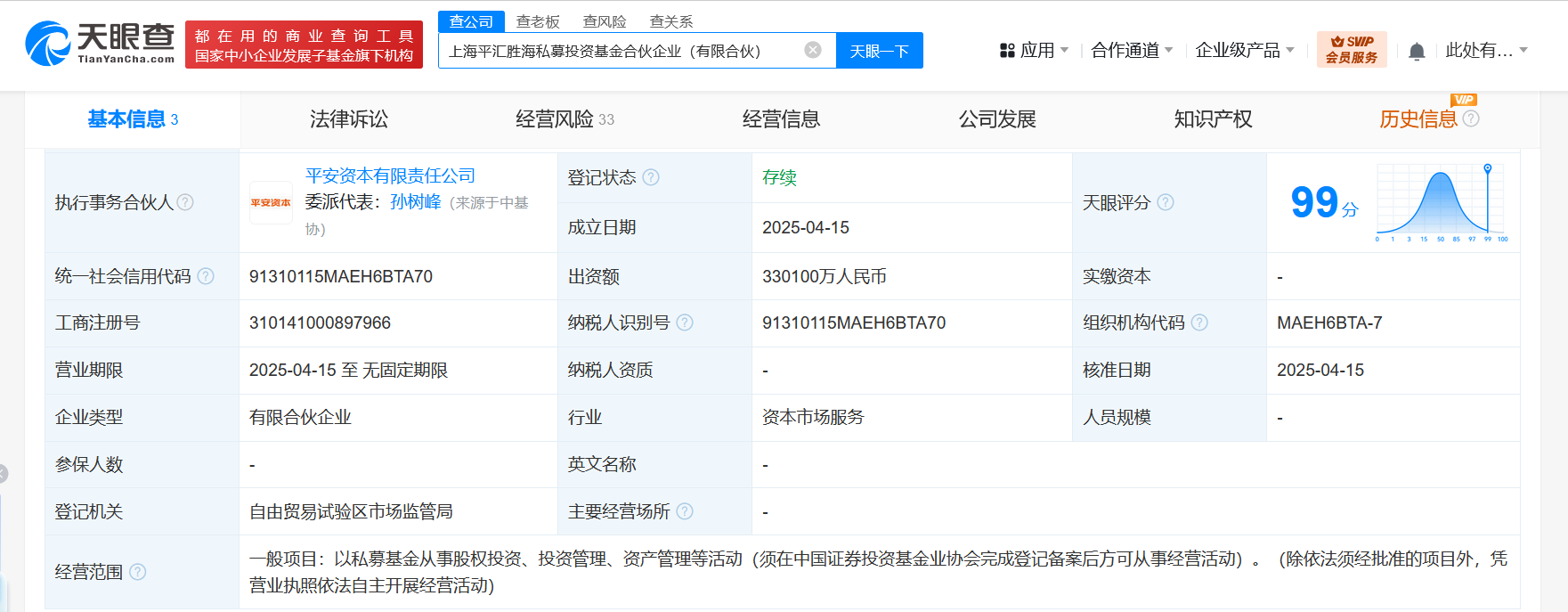 天眼查App显示,近日,上海平汇胜海私募投资基金合伙企业(有限合伙)成立,执行事务合伙人为平安资本有限责任公司,出资额33.01亿人民币,经营范围为以私募基金从事股权投资、投资管理、资产管理等活动。合伙人信息显示,该基金由平安资本有限责任公司、中国平安财产保险股份有限公司、中国平安人寿保险股份有限公司共同出资。