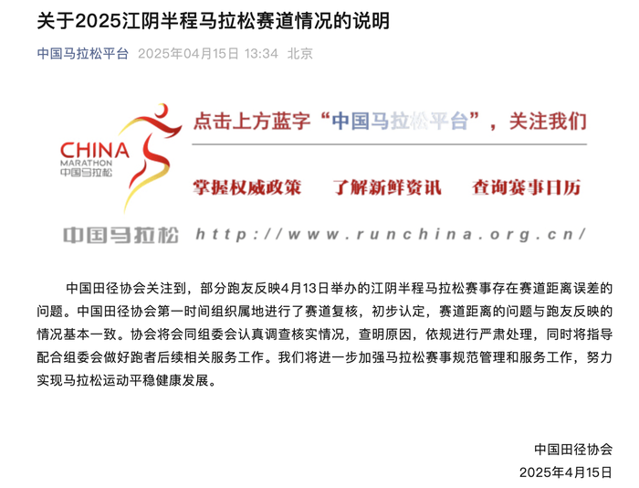4月15日,中国马拉松平台发布消息:中国田径协会关注到,部分跑友反映4月13日举办的江阴半程马拉松赛事存在赛道距离误差的问题。中国田径协会第一时间组织属地进行了赛道复核,初步认定,赛道距离的问题与跑友反映的情况基本一致。协会将会同组委会认真调查核实情况,查明原因,依规进行严肃处理,同时将指导配合组委会做好跑者后续相关服务工作。我们将进一步加强马拉松赛事规范管理和服务工作,努力实现马拉松运动平稳健康发展。