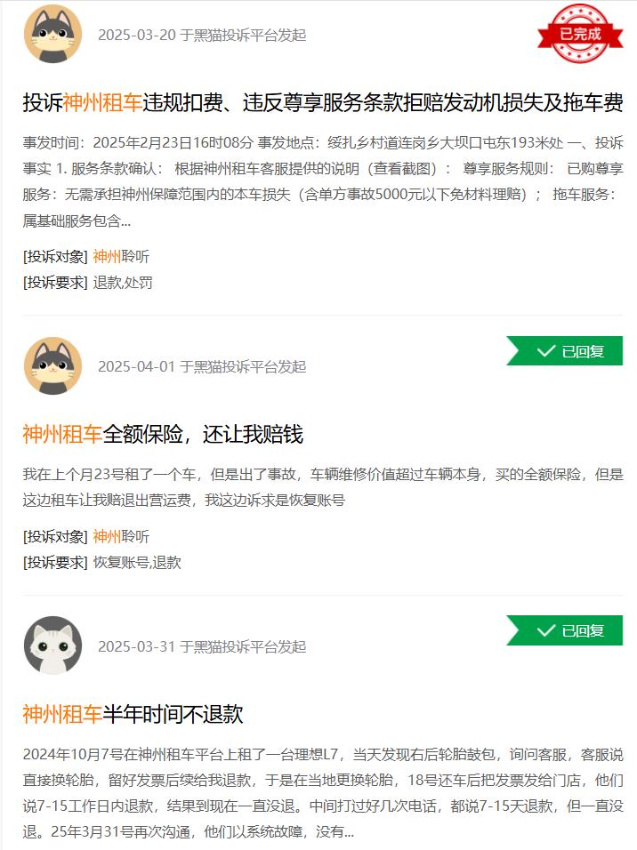 此外,从黑猫投诉平台来看,有关“神州租车”关键词的投诉高达3868条,投诉理由主要围绕“违规扣费”、“服务质量不过关”、“不退押金”等方面。