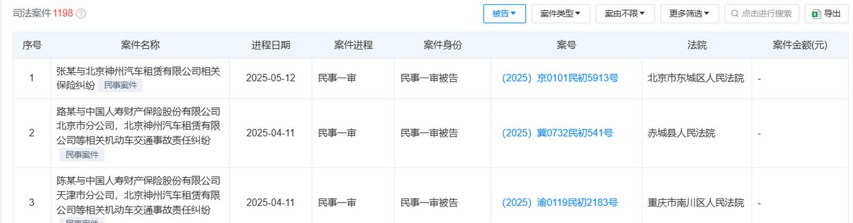 据金融界报道,近日,通过天眼查信息显示,北京神州汽车租赁有限公司(以下简称“神州租车”)频繁陷入被告官司。从2025年以来,神州租车以被告身份陷入14起案件,案由主要是机动车交通事故责任纠纷、保险人代位求偿权纠纷、买卖合同纠纷、保险纠纷,案件遍及北京、广东、江苏、上海、河北、山东、重庆地区。