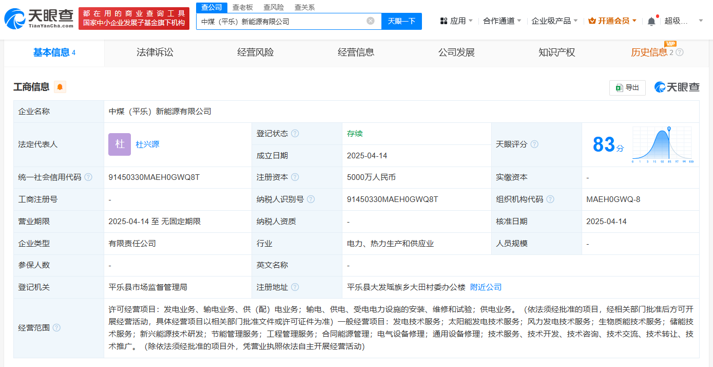 天眼查App显示,近日,中煤(平乐)新能源有限公司成立,法定代表人为杜兴源,注册资本5000万人民币,经营范围包括太阳能发电技术服务、风力发电技术服务、生物质能技术服务、储能技术服务等。股权全景穿透图显示,该公司由中国中煤旗下中煤电力有限公司、中国能建(601868)旗下中国电力工程顾问集团西南电力设计院有限公司共同持股。