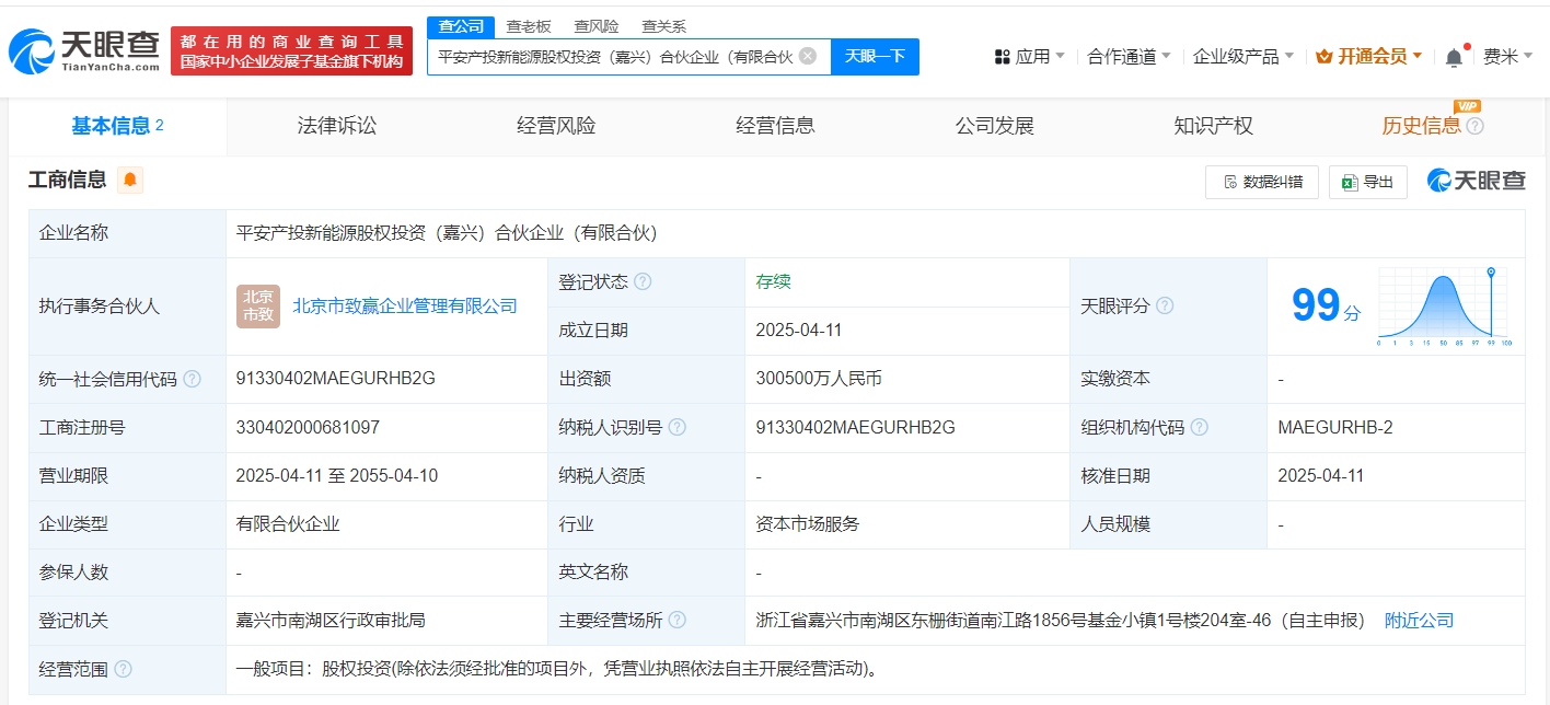 天眼查App显示,近日,平安产投新能源股权投资(嘉兴)合伙企业(有限合伙)成立,执行事务合伙人为北京市致赢企业管理有限公司,出资额30.05亿人民币,经营范围为股权投资,由中国平安人寿保险股份有限公司、北京市致赢企业管理有限公司共同出资。