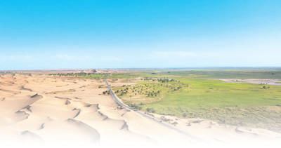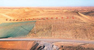 图为新疆维吾尔自治区和田地区民丰县锁边林草带。阿力木江摄