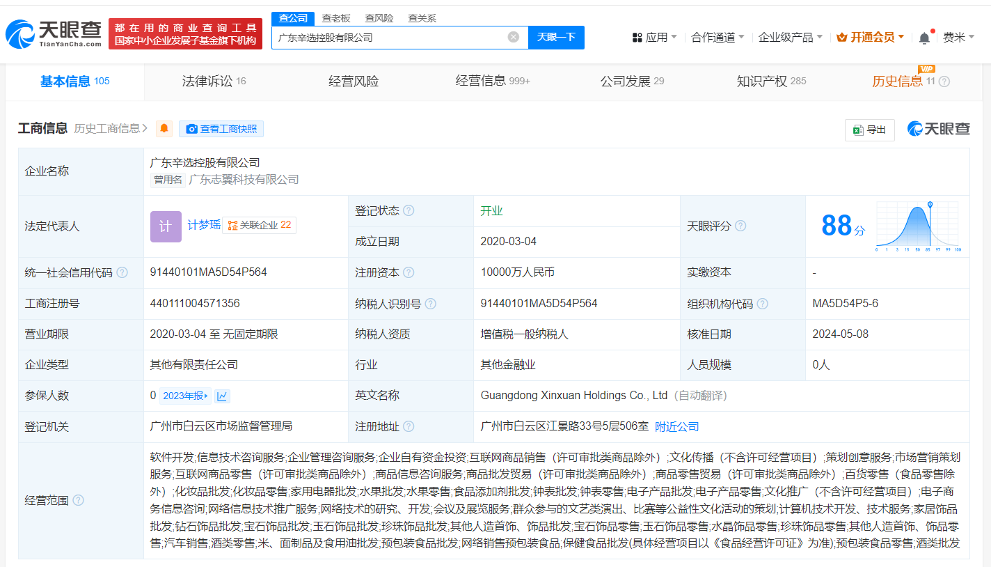 广州巴伽娱乐传媒有限公司成立于2018年11月,法定代表人为隋小龙,注册资本500万人民币,由广东辛选控股有限公司全资持股。广东辛选控股有限公司成立于2020年3月,法定代表人为计梦瑶,注册资本1亿人民币,经营范围包括软件开发、信息技术咨询服务、企业管理咨询服务等,由广州辛选投资有限公司、计梦瑶分别持股99%、1%。最终受益人信息显示,辛有志(辛巴)为上述公司实际控制人。