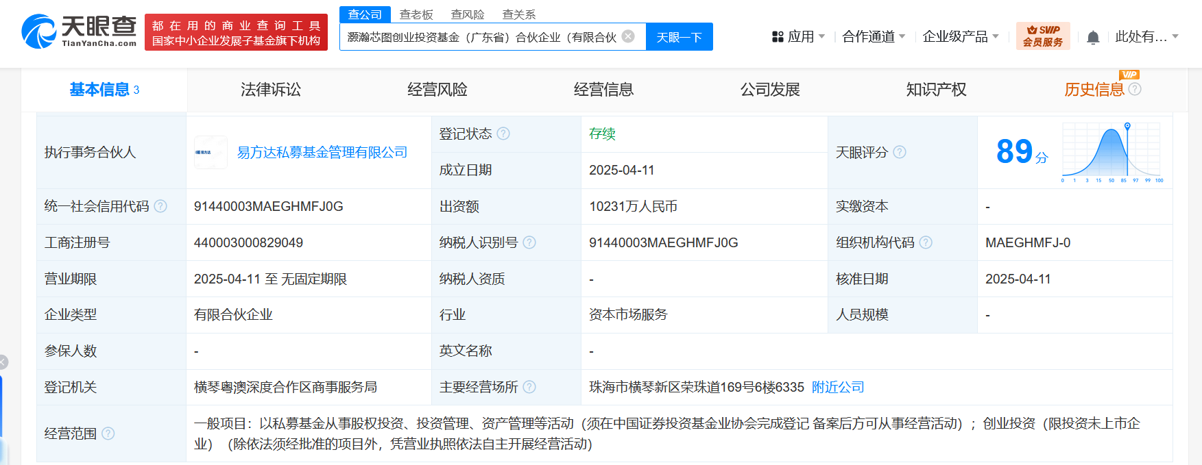 天眼查App显示,近日,灏瀚芯图创业投资基金(广东省)合伙企业(有限合伙)成立,执行事务合伙人为易方达私募基金管理有限公司,出资额约1.02亿人民币,经营范围为以私募基金从事股权投资、投资管理、资产管理等活动,创业投资。合伙人信息显示,该基金由何岳峰、龚建松、易方达私募基金管理有限公司共同出资。