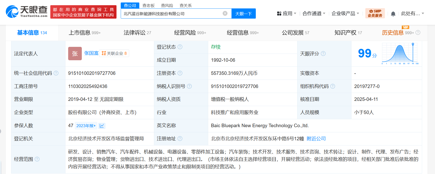 北汽蓝谷新能源科技股份有限公司成立于1992年10月,注册资本约55.74亿人民币,经营范围含研发、设计、销售汽车、汽车配件、机械设备、电器设备、零部件加工设备,汽车装饰,经济贸易咨询等,由北京汽车集团有限公司、北京汽车(HK.01958)、北汽(广州)汽车有限公司、渤海汽车(600960)等共同持股。
