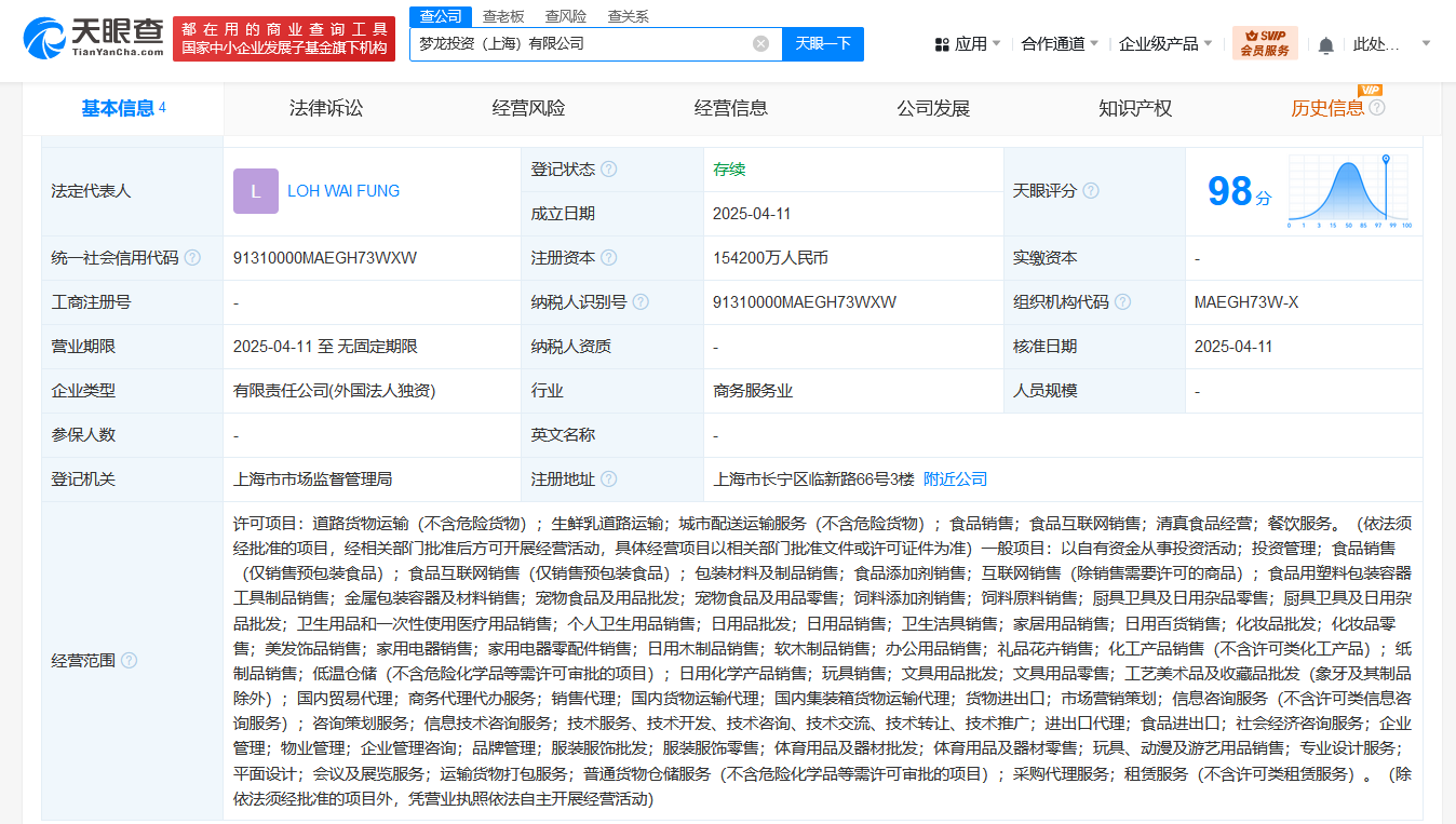 天眼查App显示,近日,梦龙投资(上海)有限公司成立,法定代表人为LOH WAI FUNG,注册资本15.42亿人民币,经营范围含道路货物运输、生鲜乳道路运输、城市配送运输服务、食品销售、食品互联网销售、清真食品经营、餐饮服务、以自有资金从事投资活动等。股东信息显示,该公司由梦龙冰淇淋关联公司THEMAGNUM ICECREAM COMPANY HOLDCO3NETHERLANDS B.V.全资持股。