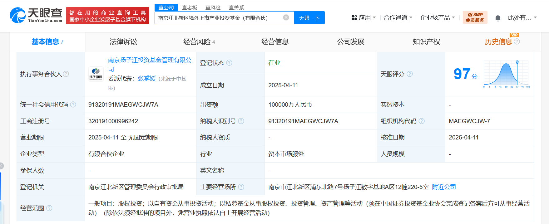天眼查App显示,近日,南京江北新区境外上市产业投资基金(有限合伙)成立,执行事务合伙人为南京扬子江投资基金管理有限公司,出资额10亿人民币,经营范围为股权投资,以自有资金从事投资活动,以私募基金从事股权投资、投资管理、资产管理等活动。合伙人信息显示,该基金由南京生物医药谷建设发展有限公司、南京扬子国资投资集团有限责任公司、南京研创投资发展有限公司等共同出资。