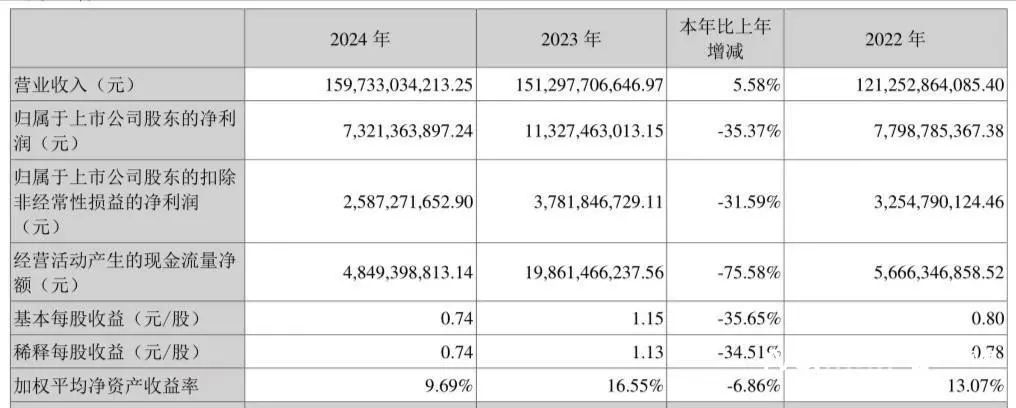 最近,重庆长安汽车股份有限公司发布了2024年年度报告。报告期内,长安汽车实现营业收入1597.33亿元,同比增长5.58%;归属于上市公司股东的净利润为73.21亿元,同比降幅为35.37%,归属于上市公司股东的扣除非经常性损益的净利润25.87亿元,同比下降31.59%。