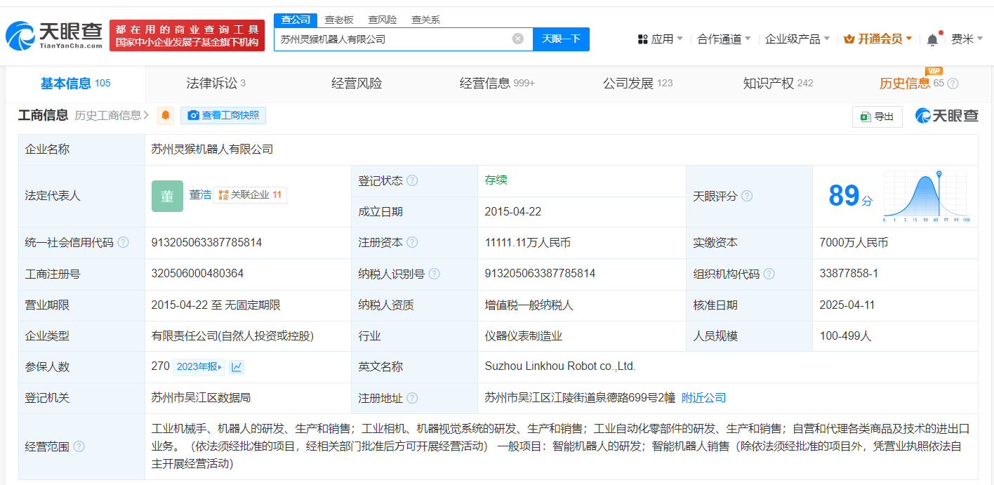 天眼查App显示,近日,苏州灵猴机器人有限公司发生工商变更,新增智元机器人关联公司上海智元新创技术有限公司、上海郁笙电子有限公司、苏州科讯园丰天使创业投资基金合伙企业(有限合伙)等为股东。