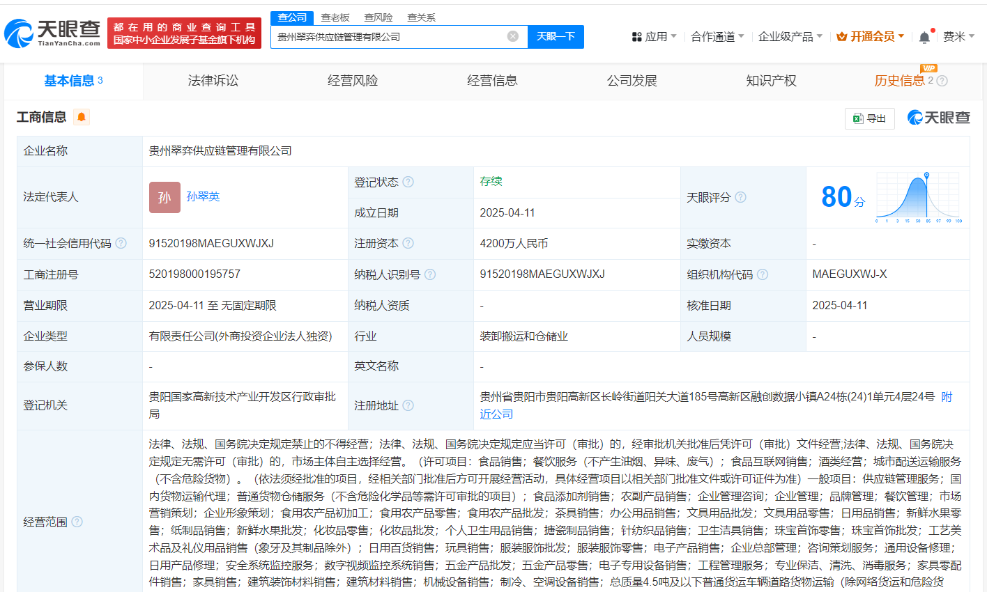 天眼查App显示,近日,贵州翠弈供应链管理有限公司成立,法定代表人为孙翠英,注册资本4200万人民币,经营范围包括食品销售、食品互联网销售、酒类经营、供应链管理服务、国内货物运输代理、企业管理咨询等,由茶颜悦色关联公司湖南茶悦文化产业发展集团有限公司全资持股。