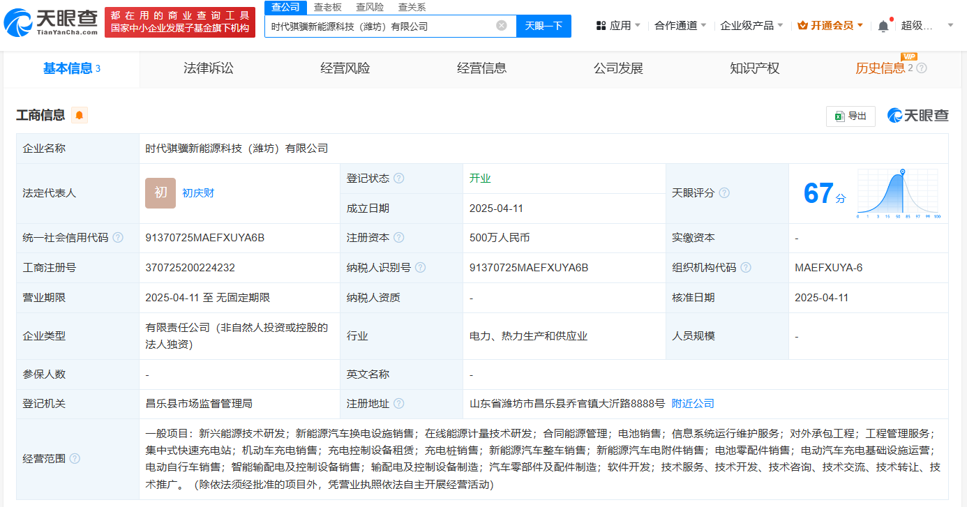 天眼查App显示,近日,时代骐骥新能源科技(潍坊)有限公司成立,法定代表人为初庆财,注册资本500万人民币,经营范围包括新兴能源技术研发、新能源汽车换电设施销售、机动车充电销售、充电控制设备租赁、充电桩销售等。股东信息显示,该公司由宁德时代旗下时代骐骥新能源科技(青岛)有限公司全资持股。