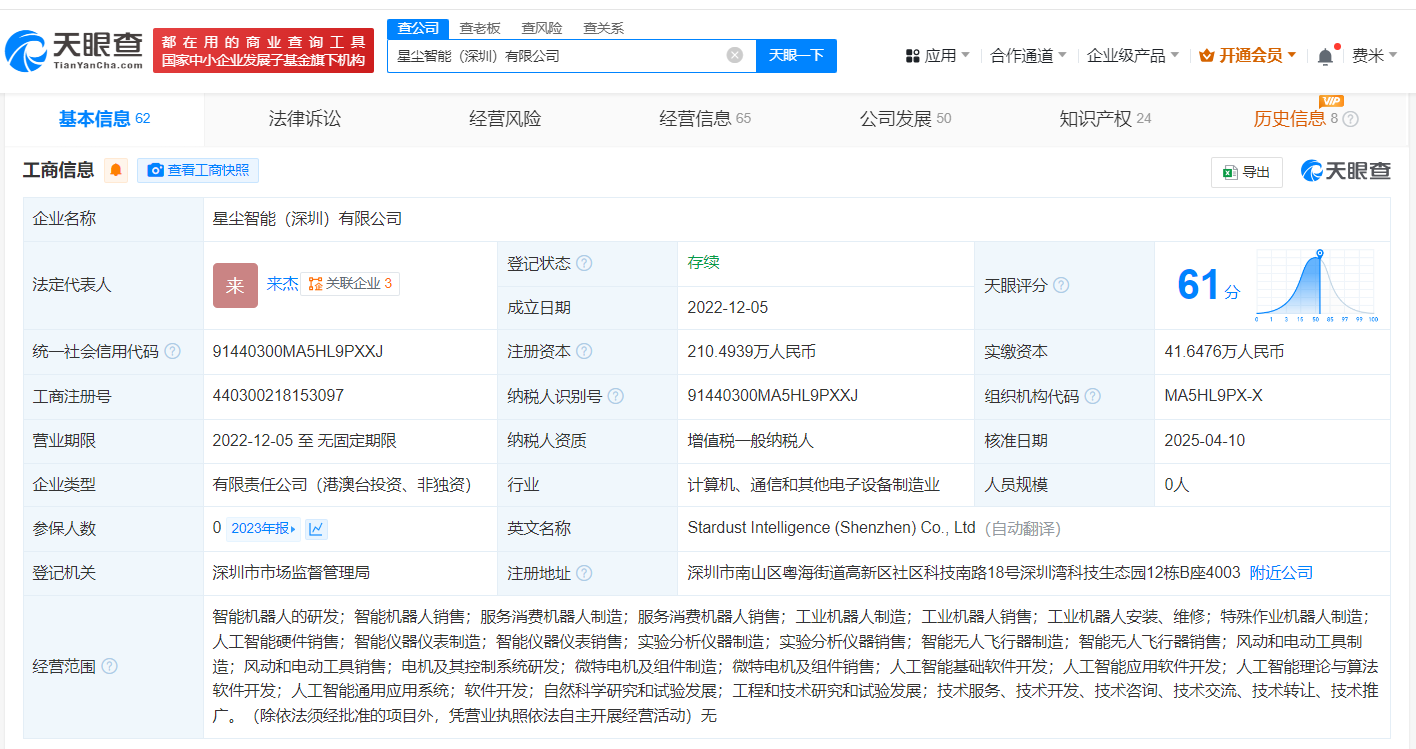 该公司成立于2022年12月,法定代表人为来杰,经营范围包括智能机器人的研发、智能机器人销售、服务消费机器人制造等,现由来杰、北京锦秋私募基金管理有限公司及上述新增股东等共同持股。