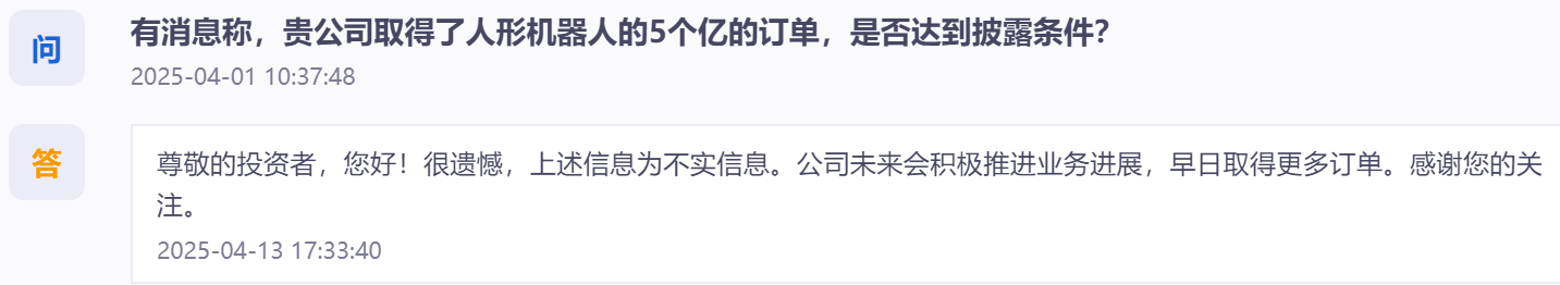 4月13日晚间,有投资者问,有消息称,公司取得了人形机器人的5个亿的订单,是否达到披露条件?汉威科技(300007.SZ)在互动平台表示,上述信息为不实信息。公司未来会积极推进业务进展,早日取得更多订单。