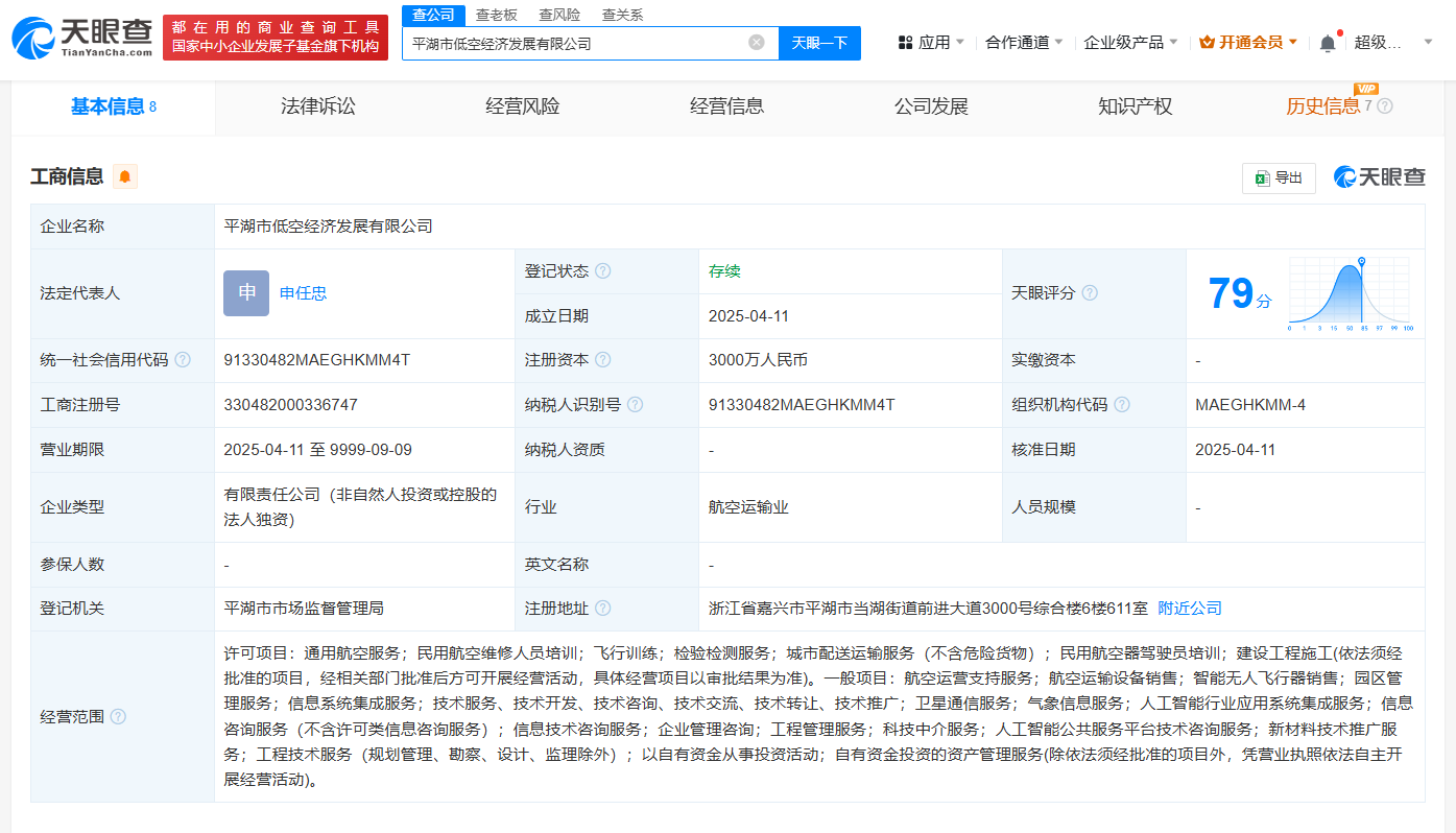 天眼查App显示,近日,平湖市低空经济发展有限公司成立,法定代表人为申任忠,注册资本3000万人民币,经营范围包括通用航空服务、民用航空维修人员培训、飞行训练、检验检测服务等。股东信息显示,该公司由平湖市交投工业投资有限公司全资持股。