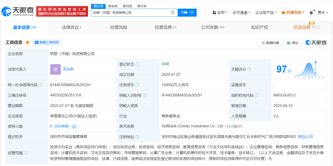 该公司成立于2020年7月,注册资本10亿人民币,经营范围包括创业投资业务、投资咨询、经济信息咨询等,由软银投资机构株式会社全资持股。