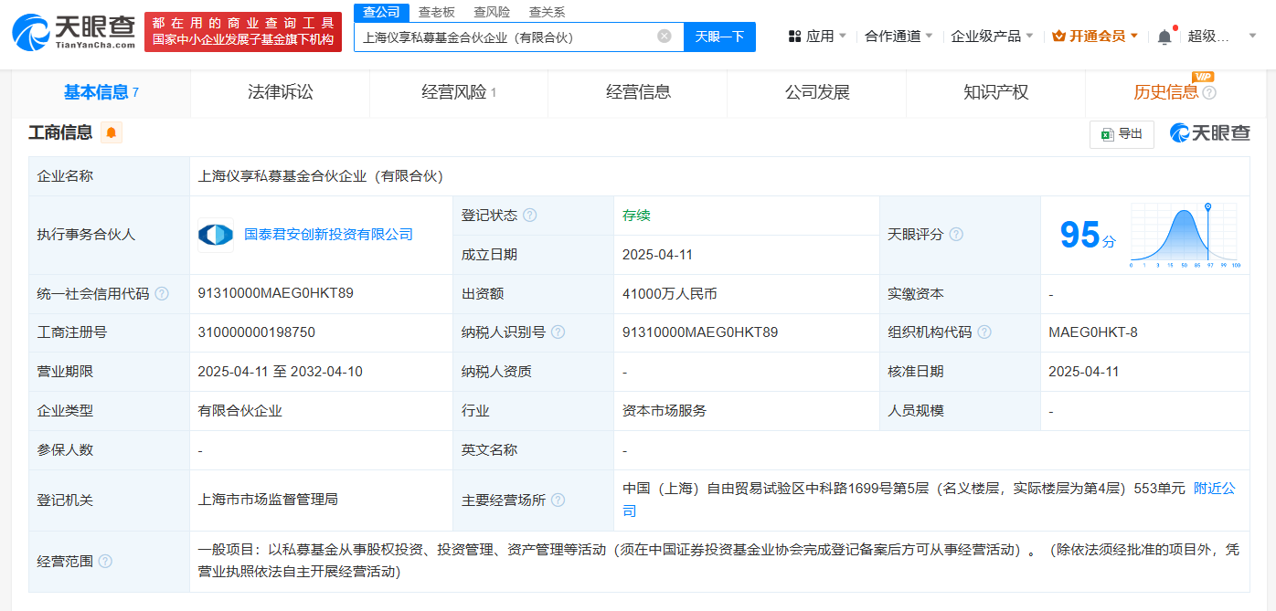 天眼查App显示,近日,上海仪享私募基金合伙企业(有限合伙)成立,执行事务合伙人为国泰君安创新投资有限公司,出资额4.1亿人民币,经营范围包括以私募基金从事股权投资、投资管理、资产管理等活动。合伙人信息显示,该基金由上海汽车工业(集团)有限公司、扬州新材料投资集团有限公司、国泰君安创新投资有限公司等共同出资。