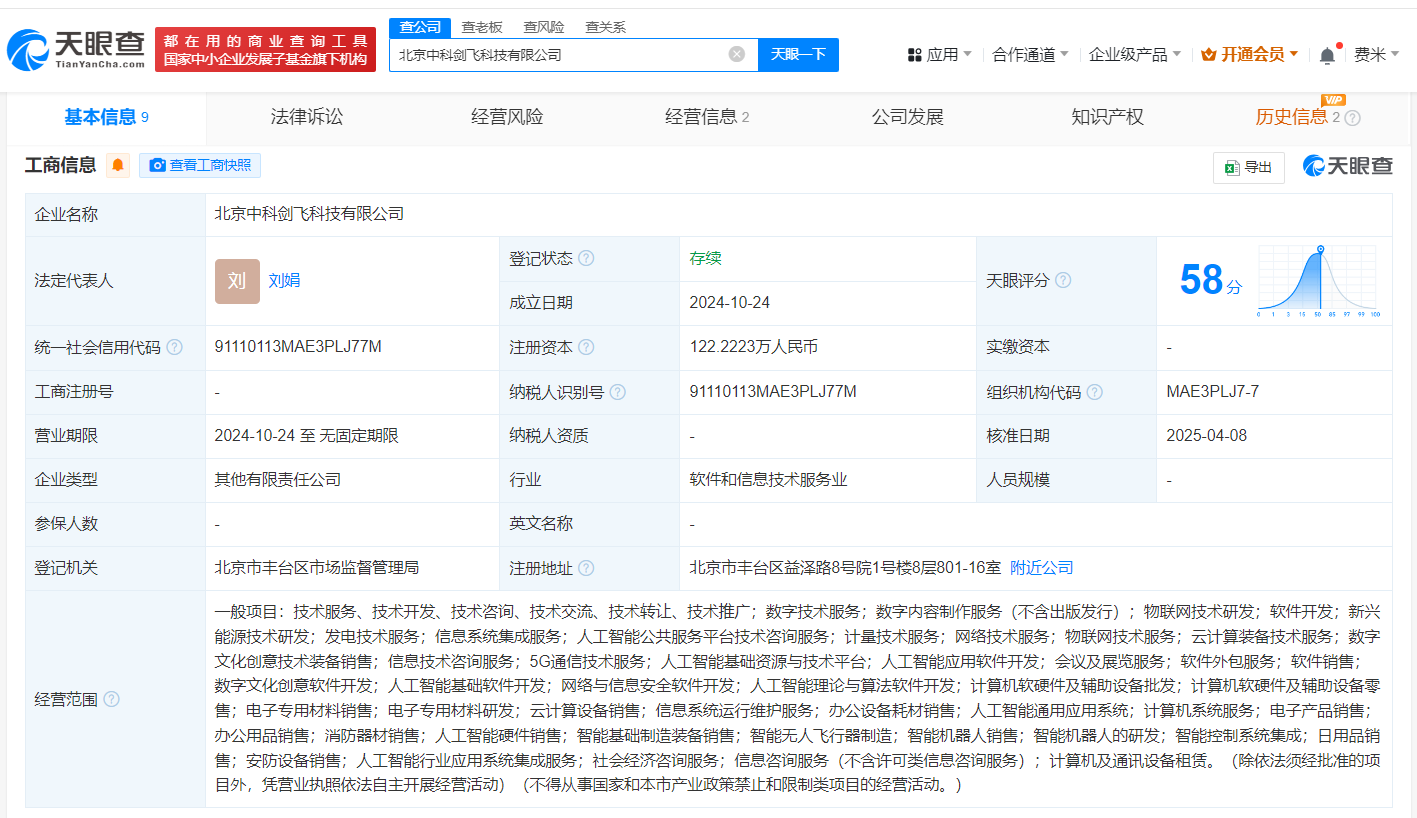 该公司成立于2024年10月,法定代表人为刘娟,经营范围包括智能基础制造装备销售、智能无人飞行器制造、智能机器人销售、智能机器人的研发、智能控制系统集成等,现由北京中科剑飞技术咨询合伙企业(有限合伙)、北京中科剑飞科技合伙企业(有限合伙)及上述新增股东共同持股。